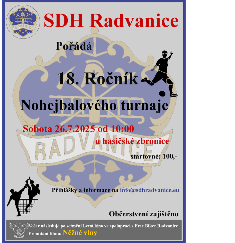 SDH Radvanice pořádá 18. ročník nohejbalového turnaje trojice a večer následuje ve spolupráci s Free Biker Radvanice promítání filmu Něžné vlny